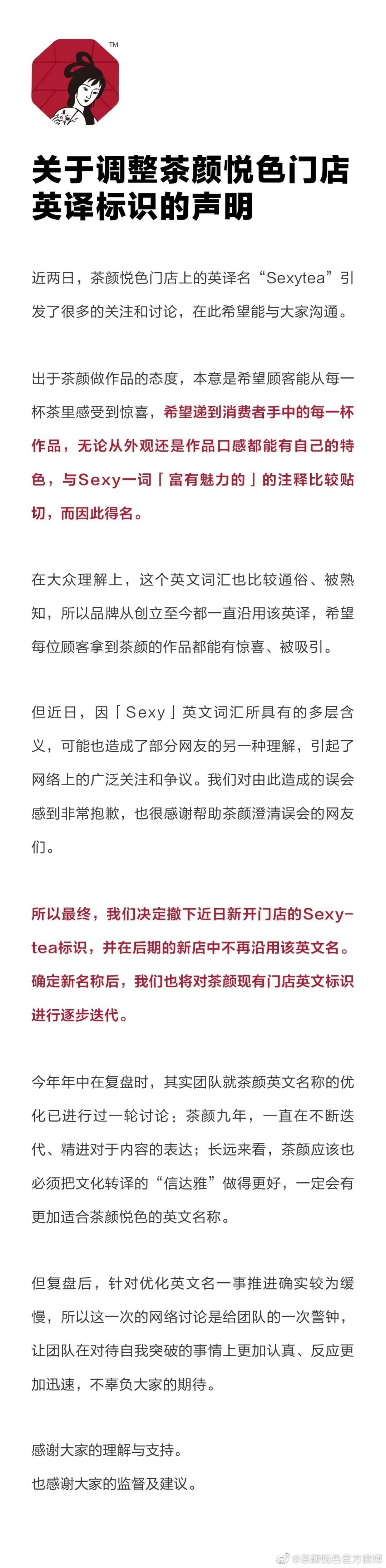 對(duì)此,茶顏悅色在聲明中表示,近兩日,門店上的英譯名“Sexytea”引發(fā)了很多的關(guān)注和討論,因Sexy英文詞匯所具有的多層含義,可能也造成了部分網(wǎng)友的另一種理解,引起了網(wǎng)絡(luò)上的廣泛關(guān)注和爭(zhēng)議,對(duì)由此造成的誤會(huì)感到非常抱歉。