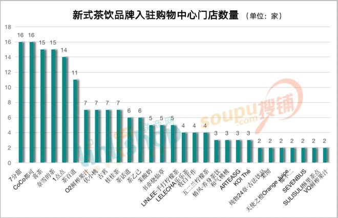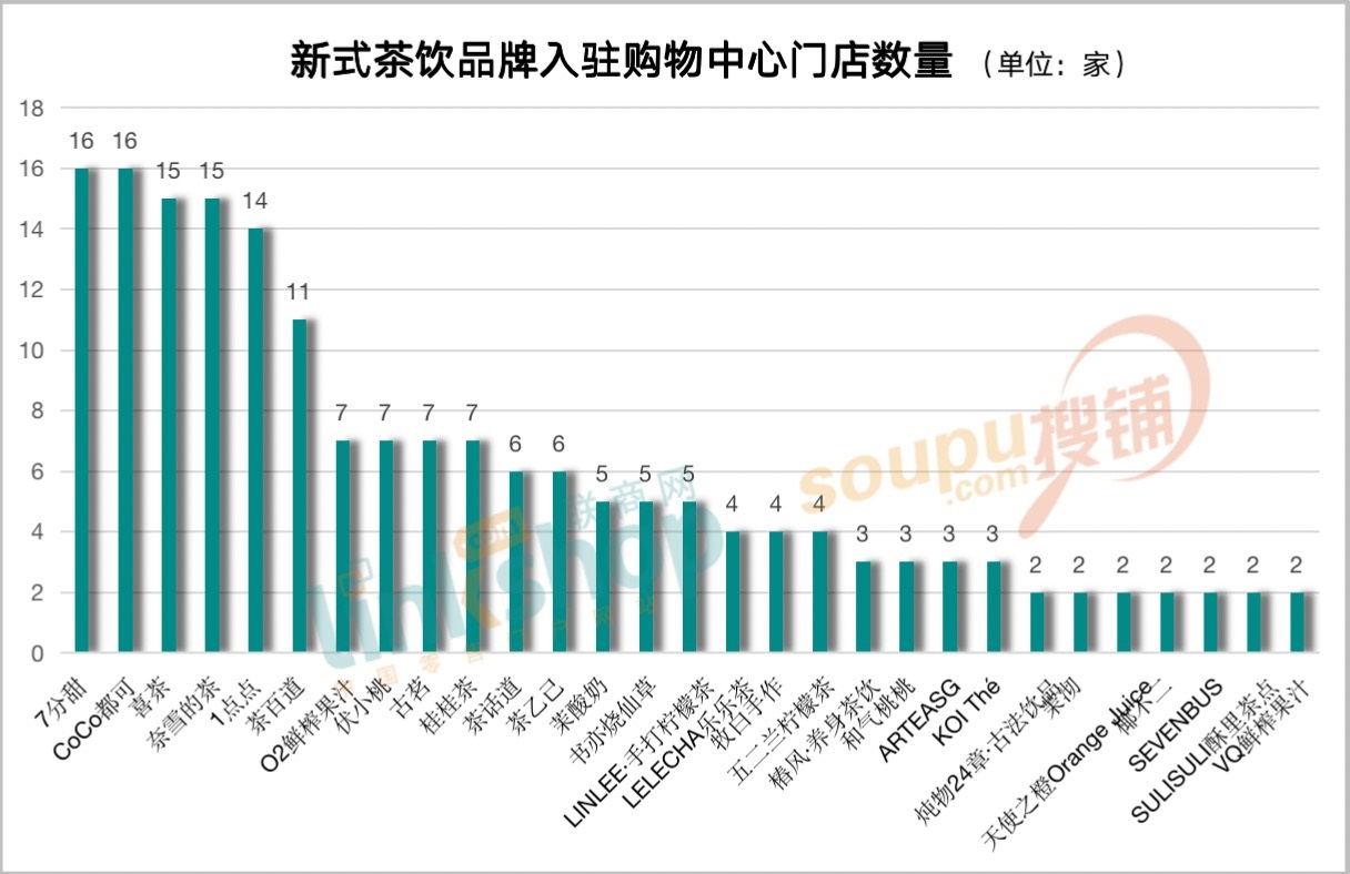 據(jù)聯(lián)商網(wǎng)零售研究中心統(tǒng)計(jì),從茶飲品牌入駐這23家購(gòu)物中心門店數(shù)量上看,其中,7分甜、CoCo都可的門店數(shù)量各為16家,在71個(gè)品牌中排名第一,喜茶、奈雪的茶門店數(shù)量各為15家,排名第二,1點(diǎn)點(diǎn)門店數(shù)量為14家,排名第三。