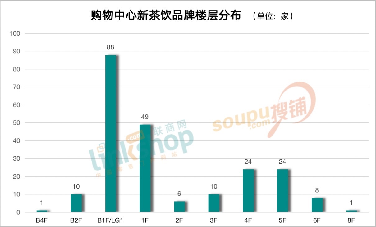 從樓層統(tǒng)計(jì)上來看,負(fù)一層是茶飲品牌最愛的樓層選址,221家茶飲門店中有88家選址在負(fù)一樓,占比39%;其次是一樓,共有49家,占比22%,四樓和五樓分別為24家。其他樓層如負(fù)二樓、三樓、六樓門店數(shù)量也不少。