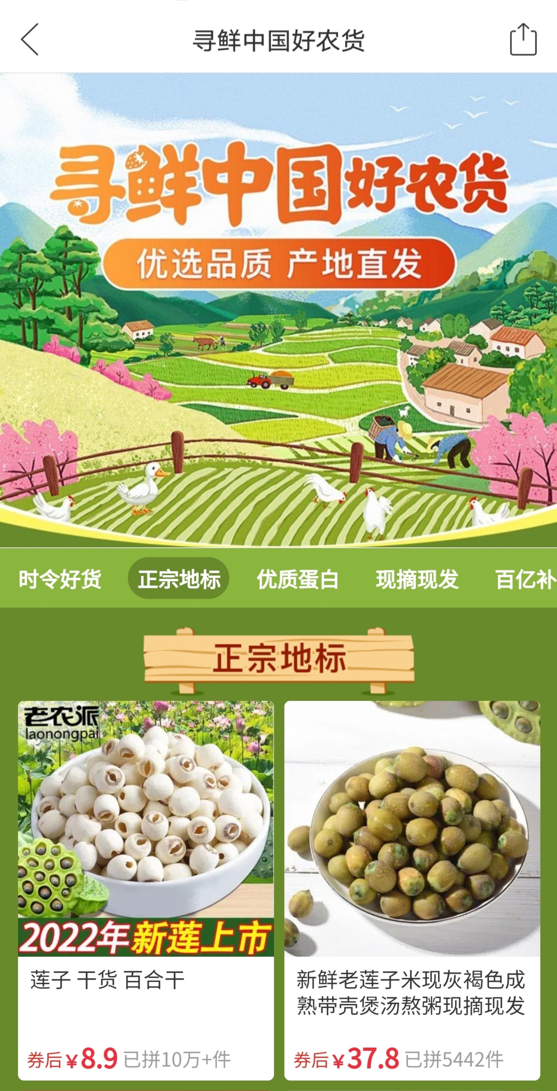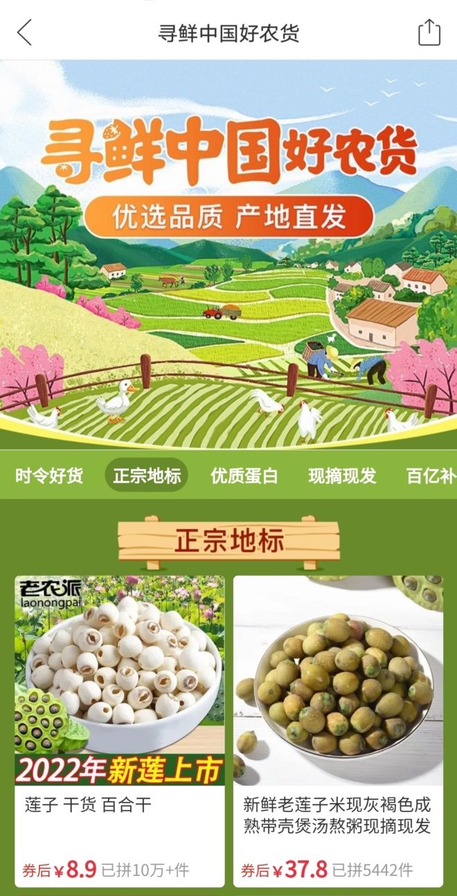打開拼多多app,搜索“尋鮮中國”“多多好農(nóng)貨”“好農(nóng)貨”等關(guān)鍵詞,即可直達專區(qū),選購時令地標(biāo)農(nóng)貨,品嘗最新鮮、最實惠的好味道