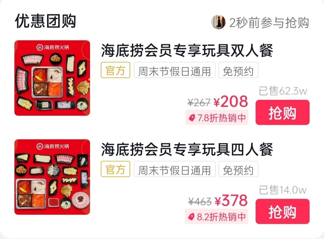 仔細看這個套餐內(nèi)容,“海底撈會員專享玩具雙人餐”,208元一份,2種鍋底加一些菜品,還有兩個小玩具。