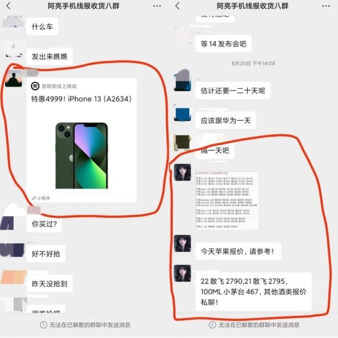 在易聯(lián)購上購買了預(yù)售iPhone14的泡泡表示,阿亮收貨群類似是一個(gè)“黃牛群”或者“羊毛黨”聚集地,在群里推易聯(lián)購的是檔口收貨的人,表示自己會(huì)回收大家搶到的iPhone13,“當(dāng)時(shí)我沒急著下單,群里有些膽大的人下單后確實(shí)收到貨了,檔口確實(shí)也收了這些貨,我才開始跟著下單!