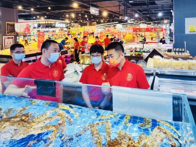 在參加完合家福22周年慶典儀式后,集團公司黨委書記、董事長劉浩隨即走進合家福高新店指導常態(tài)化疫情防控及經(jīng)營發(fā)展工作。劉浩董事長先后來到生鮮食品、海鮮食堂、電商分揀等區(qū)域,詳細了解節(jié)前市場供應、商品儲備情況,并與門店負責人深入交談。