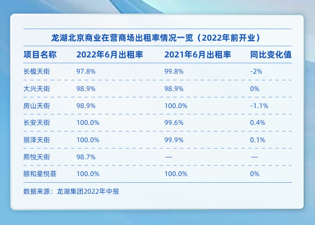 根據(jù)龍湖集團(tuán)8月下旬發(fā)布的2022年中報(bào),截至今年6月,龍湖商業(yè)北京在營商場的平均出租率(不包含6月之后開業(yè)的亦莊天街),超過了99%。