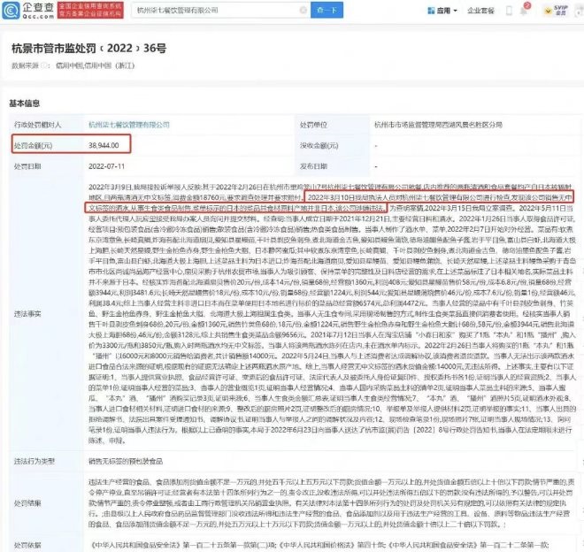 企查查APP顯示,近日,杭州柒七餐飲管理有限公司因銷售無標簽的預包裝食品被杭州市市場監(jiān)督管理局西湖風景名勝區(qū)分局罰款38944元。