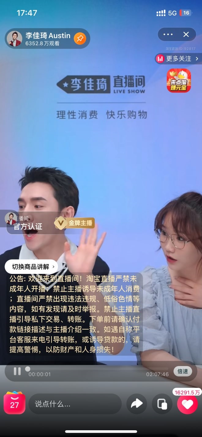 李佳琦與助理旺旺一起出現(xiàn)在直播間,直播間背景圖也打出了“理性消費(fèi) 快樂(lè)購(gòu)物”字樣。直播中,李佳琦也多次呼吁粉絲,不要沖動(dòng)消費(fèi),家里已經(jīng)有的東西可以不用買(mǎi)。