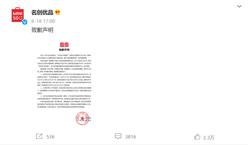 名創(chuàng)優(yōu)品微博致歉
