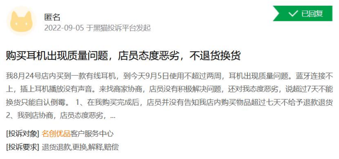 在黑貓投訴平臺(tái)上,有關(guān)名創(chuàng)優(yōu)品的投訴量有1478條,其中很多都與產(chǎn)品質(zhì)量問題有關(guān)。今年9月,有網(wǎng)友在黑貓投訴上反映,在名創(chuàng)優(yōu)品買的耳機(jī)不到兩周就出現(xiàn)“播放沒有聲音”的情況,但店員以購買超過七天為由,不給退款退貨。該網(wǎng)友表示,盡管耳機(jī)只有25元,但不接受使用兩周不到就出現(xiàn)質(zhì)量問題。