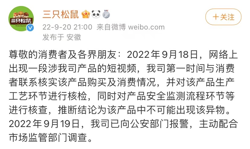 9月20日晚9點,三只松鼠針對近日“油炸壁虎”事件發(fā)文宣布,三只松鼠已于9月19日向公安機關報警,并主動配合市場監(jiān)管部門調查。