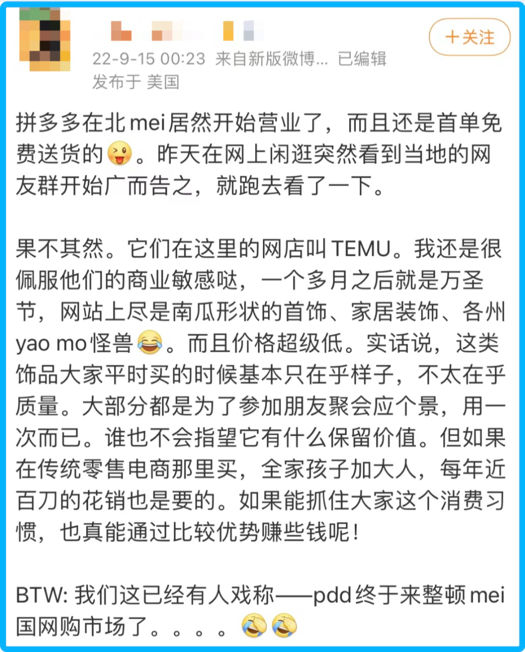 以萬圣節(jié)飾品為例,平臺相關(guān)商品不少低至1美金以下,目前已有多位身處美國的消費(fèi)者關(guān)注到Temu網(wǎng)站,直感嘆“價(jià)格超級低……如果能抓住這個消費(fèi)習(xí)慣,(拼多多)也真能通過比較優(yōu)勢賺些錢呢”。