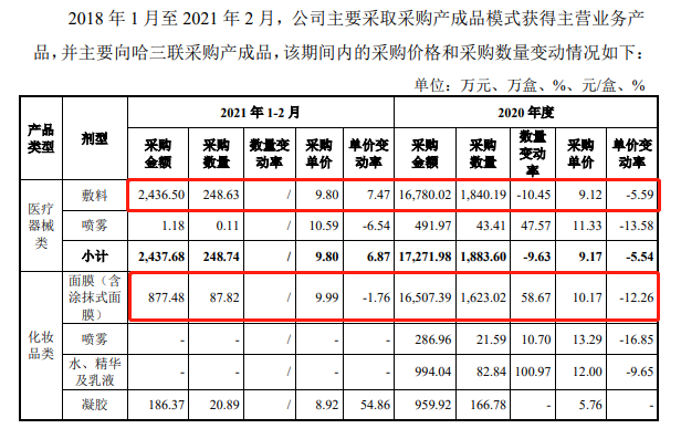 其中2020年至2021年1-2月份期間,公司向哈三聯(lián)采購敷料單價分別為9.12元/瓶和9.8元/瓶,采購面膜單價為10.17元/盒和9.99元/盒。