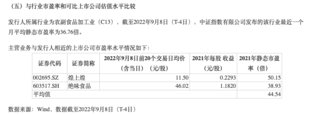 根據(jù)紫燕食品發(fā)行公告,其發(fā)行市盈率為22.99倍,而該行業(yè)最近一個月平均靜態(tài)市盈率為36.76倍。而煌上煌和絕味食品2021年靜態(tài)市盈率分別為50.15倍和38.93倍。