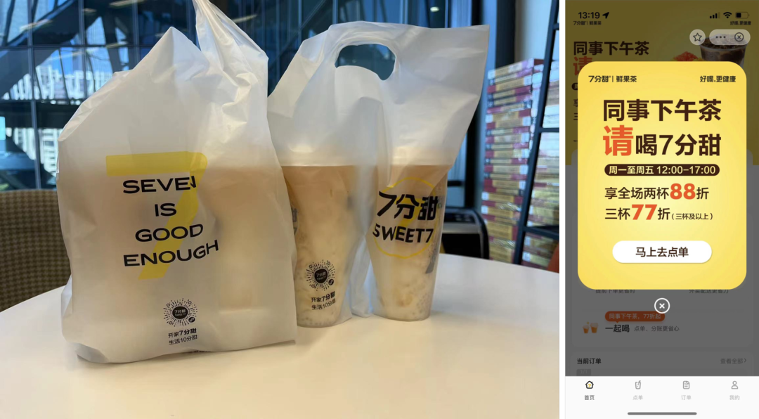 緊鄰華貿(mào)寫字樓,七分甜也自然沒有放過寫字樓白領(lǐng)的下午茶市場。其點單小程序中,工作日12點到17點,有「同事下午茶、請喝七分甜」的活動,全場兩杯88折,3杯及以上77折。