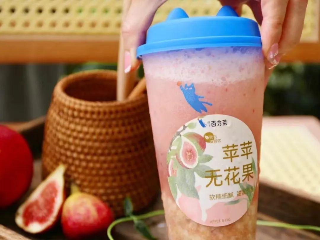 喜茶首次上新柿子茶“喜柿多多”,第一天就刷屏了小紅書;百分茶上了一款“蘋蘋無花果”,蘋果+無花果的搭配,也讓人眼前一亮。