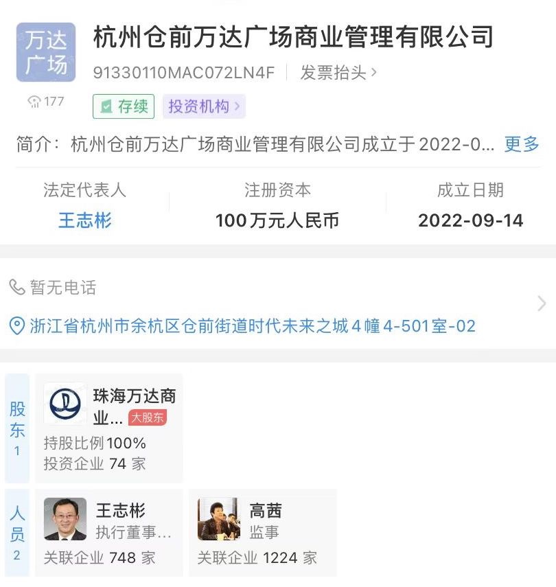 據(jù)企查查APP顯示,日前,珠海萬(wàn)達(dá)商業(yè)管理有限公司新增一條注冊(cè)信息。內(nèi)容顯示,珠海萬(wàn)達(dá)商管于9月14日成立杭州倉(cāng)前萬(wàn)達(dá)廣場(chǎng)商業(yè)管理有限公司,注冊(cè)地址為浙江省杭州市余杭區(qū)倉(cāng)前街道時(shí)代未來(lái)之城4幢4-501室-02,正是杭州奧克斯廣場(chǎng)綜合體的寫(xiě)字樓。