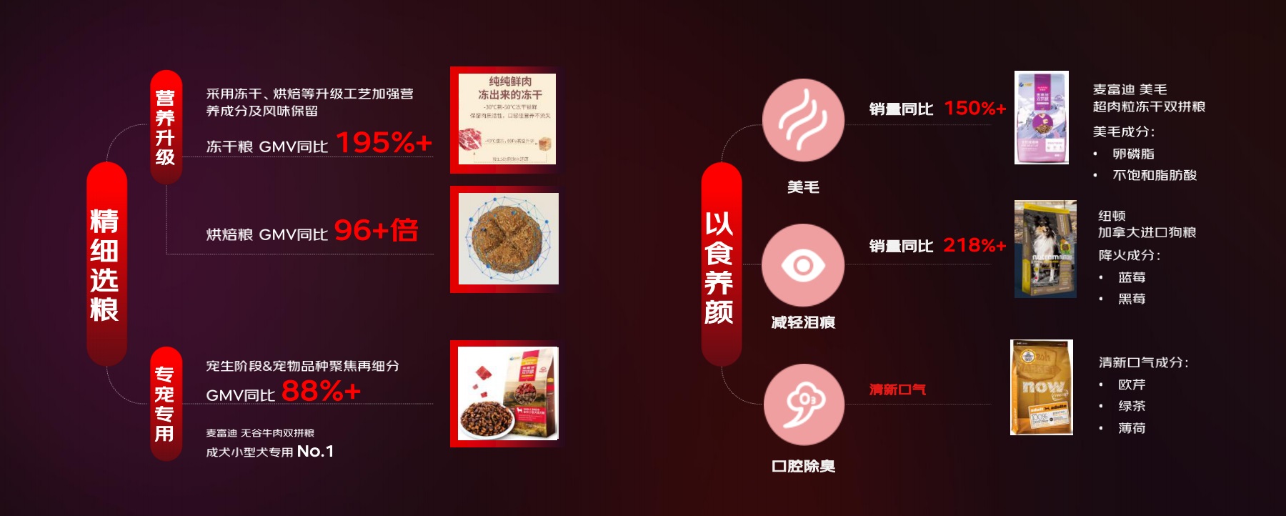 除了在營(yíng)養(yǎng)方面有了更高要求,“專寵專用”理念也越發(fā)深入人心,細(xì)分不同年齡段、不同體型、不同品種的寵物專用糧同樣增長(zhǎng)迅速;此外,在“以食養(yǎng)顏”方面,具備美毛、減輕淚痕、口腔除臭等功能的主糧也有明顯增長(zhǎng)。