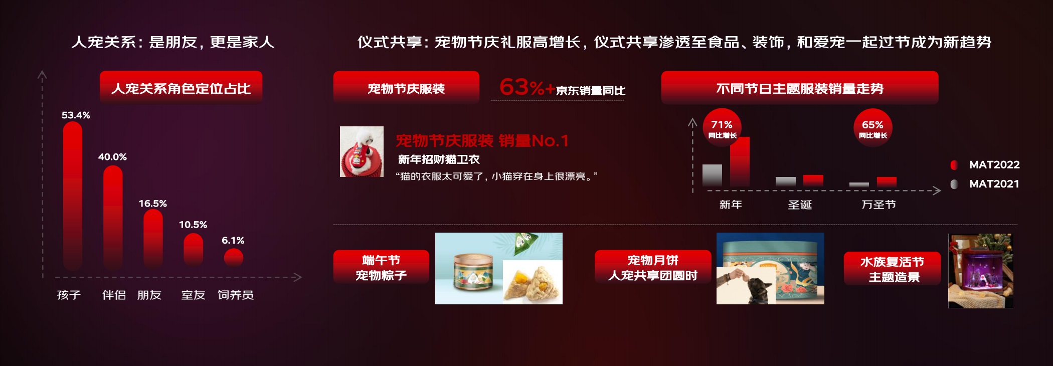 在寵物用品上,高科技智能產(chǎn)品受到消費(fèi)者追捧,陪伴機(jī)器人交易額同比增長(zhǎng)192%。在健康養(yǎng)寵觀念帶動(dòng)下,越來(lái)越多寵物主關(guān)注預(yù)防,內(nèi)外同驅(qū)產(chǎn)品GMV同比增長(zhǎng)近60%,保健寵糧增長(zhǎng)超80%。值得注意的是,隨著人寵關(guān)系的角色定位逐漸向平權(quán)化方向發(fā)展。和愛寵一起過(guò)節(jié)成為新趨勢(shì),這一趨勢(shì)也體現(xiàn)在了節(jié)慶服裝、節(jié)日零食的顯著增長(zhǎng)上。