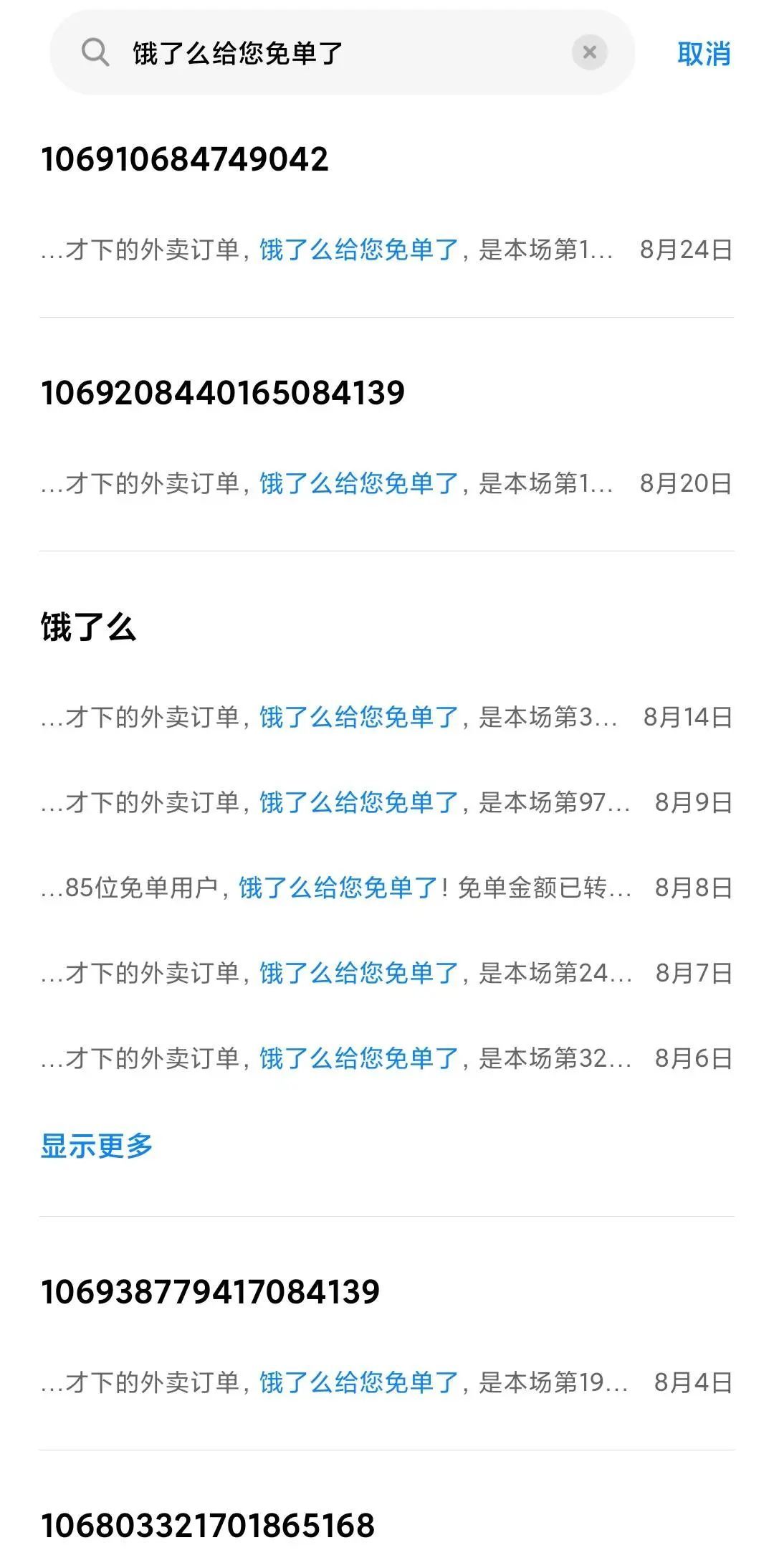 如下圖,便是我在手機短信中搜索關(guān)鍵詞得到的免單短信提醒,而這,只是我用來搶單的三個設(shè)備中的一個。