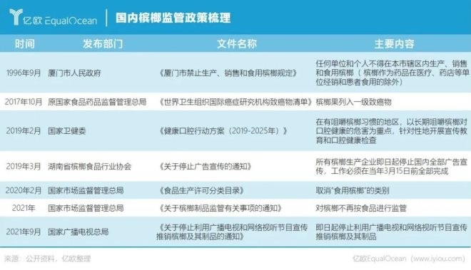 億歐梳理相關(guān)新聞后發(fā)現(xiàn),最早的“檳榔禁令”出現(xiàn)在1996年,近年來的監(jiān)管手段越來越密集和嚴(yán)格,主要集中在兩方面,一是在剝奪檳榔作為食品的身份,二是在禁止廣告宣傳。傅松事件后各地爆發(fā)的這波監(jiān)管行動(dòng),也是基于近年來陸續(xù)出臺的各種各樣的監(jiān)管政策。