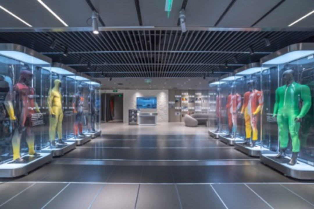 二層的迷你品牌博物館全新升級,如時空隧道般的空間中,陳列了4件2022年北京冬奧會迪桑特贊助的冰雪國家隊比賽服和2件2020年東京奧運會贊助鐵三國家隊比賽服,以及品牌歷史上2件劃時代的比賽服MAGIC SUIT魔法運動套裝和GOLDEN SUIT黃金戰(zhàn)袍,帶領(lǐng)參觀者回顧迪桑特的歷史與榮耀。在隧道的盡頭是品牌歷史墻,將品牌87年發(fā)展史中的科技里程碑一一呈現(xiàn)。