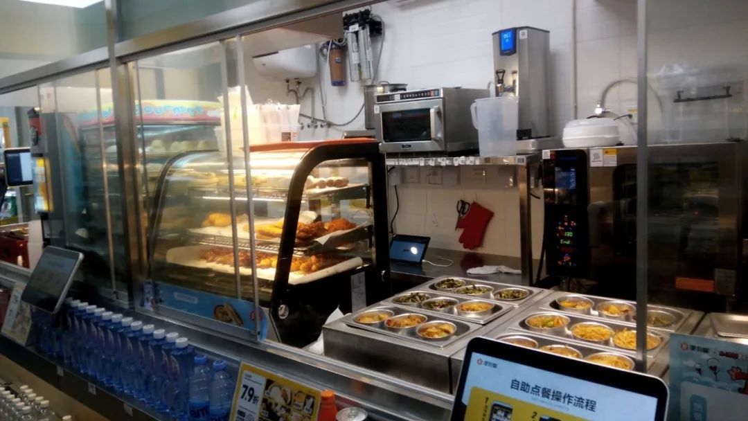 這些熱餐,由中央廚房統(tǒng)一將切好的食材和調味品配送到各家店鋪,便利店只需要按照生產計劃,按時按量加工即可,在顧客點餐后裝盒。2-3個菜品+米飯一起賣,平均客單價15元左右。