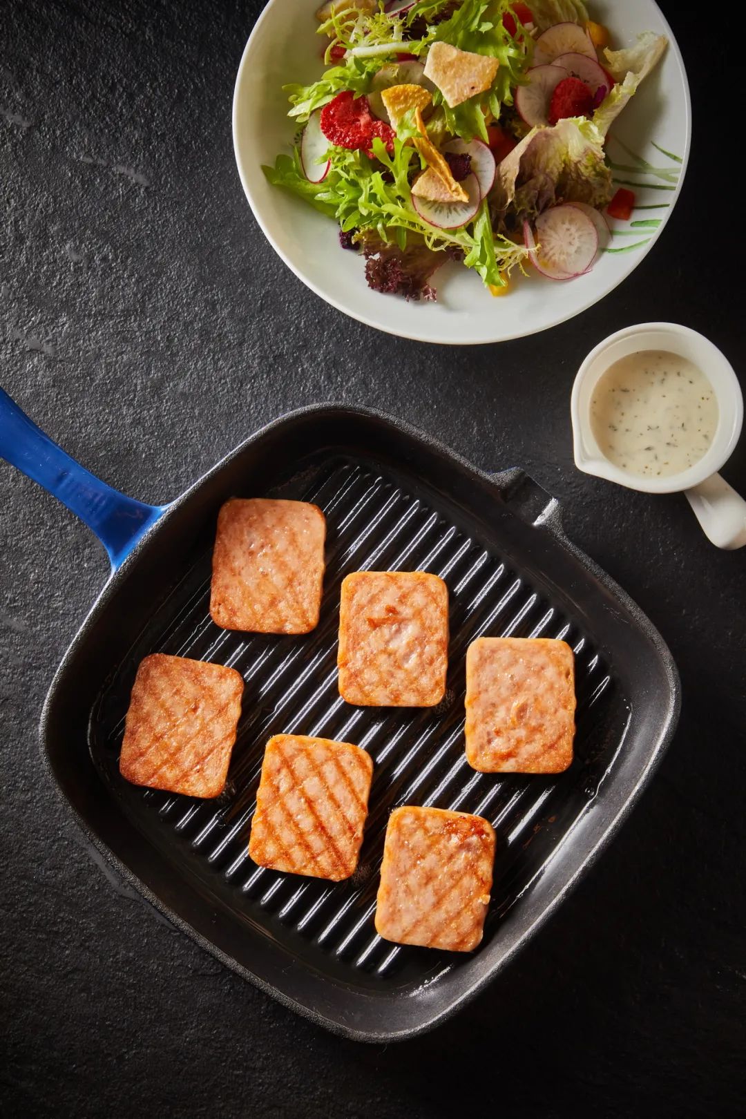 (2)精選豬肉優(yōu)質(zhì)部位,產(chǎn)品肉含量超過90%。經(jīng)過王家渡研發(fā)人員和廚師團(tuán)隊數(shù)百次測試發(fā)現(xiàn),午餐肉的香味主要來自脂肪、鮮味主要來自瘦肉,瘦肉和肥肉達(dá)到理想比例時,會帶來較好的口感體驗。超高肉含量、理想的肥瘦比例會給消費者帶來極佳口感體驗。