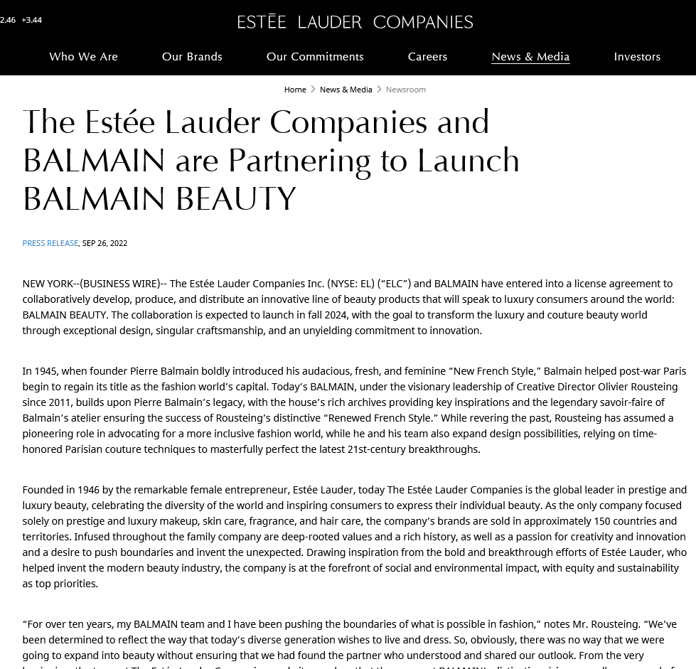 今年8月,雅詩蘭黛將接手奢侈品牌Balmain美妝業(yè)務的消息不脛而走,就在昨日,雅詩蘭黛在其官網(wǎng)正式確認雙方合作。