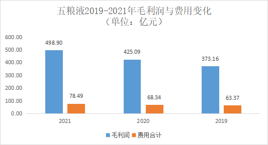 2020、2021五糧液兩期的毛利潤同比增長分別為51.93億元和73.81億元,費(fèi)用合計(jì)同比增長量分別為4.98億元、10.15億元。毛利潤的增長幅度遠(yuǎn)超費(fèi)用支出的增長幅度,說明五糧液能實(shí)現(xiàn)較好的費(fèi)用控制管理和營業(yè)增長。