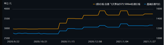 評價(jià)一款白酒是不是高端品牌,最直觀的是產(chǎn)品價(jià)格與主打產(chǎn)品的保值能力。從同花順的數(shù)據(jù)中可以看到,貴州茅臺(tái)的代表產(chǎn)品53°飛天茅臺(tái)始終處于一個(gè)較高的價(jià)格段位,其他高端產(chǎn)品走勢也基本趨同(2020.9.22至2021.1.27)。