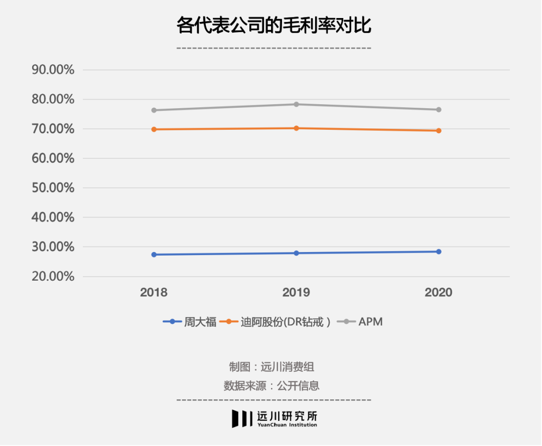 因而,低溢價(jià)、低毛利成了黃金珠寶品牌的共同特征,上游金礦開采行業(yè)平均有50%毛利率,而下游品牌商只有20%左右。