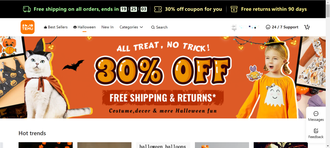 同時(shí),Temu選擇了萬圣節(jié)作為切入口,「電商在線」對(duì)比發(fā)現(xiàn),亞馬遜、速賣通、SHEIN和Wish等跨境平臺(tái)并沒有將萬圣節(jié)作為主推,Temu可能是為了在話題上與其他平臺(tái)形成差異化,同時(shí)又可以在國(guó)外節(jié)假日進(jìn)行時(shí)間節(jié)點(diǎn)營(yíng)銷。