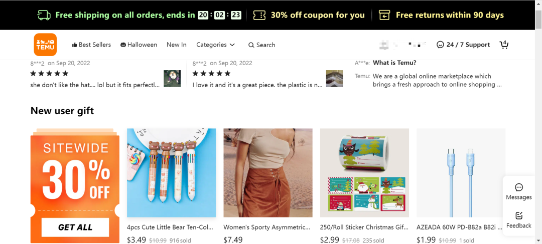 需要注意的是,這些看起來很低的價(jià)格并不是最終價(jià)格,新用戶還可以領(lǐng)取七折優(yōu)惠券疊加使用,最終支付的價(jià)格會(huì)比頁面顯示的更低。如此低價(jià)的情況下,Temu還推出了免費(fèi)配送和90天內(nèi)免費(fèi)退貨服務(wù),吸引了不少消費(fèi)者。