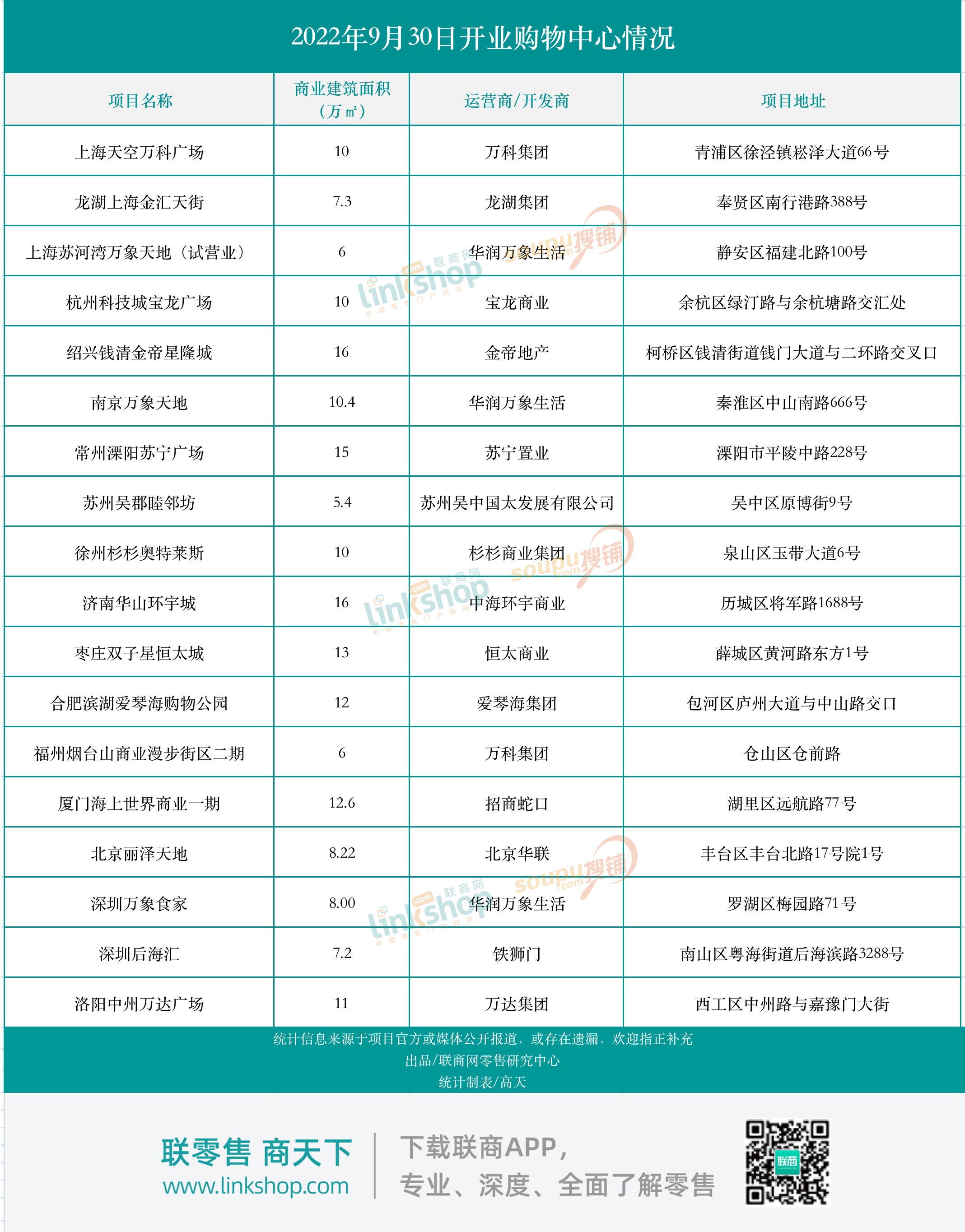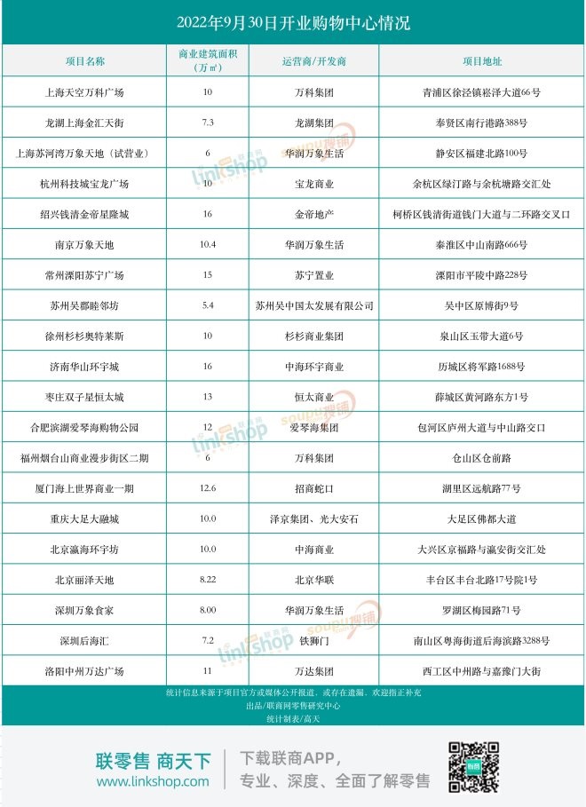 據(jù)《聯(lián)商網(wǎng)》統(tǒng)計,9月30日,深圳萬象食家、深圳后海匯、上海天空萬科廣場、龍湖上海金匯天街、南京萬象天地、杭州科技城寶龍廣場、廈門海上世界一期、福州煙臺山漫步街區(qū)二期、上海蘇河灣萬象天地等20家購物中心將開業(yè)。其中上海蘇河灣萬象天地、徐州杉杉奧特萊斯是試營業(yè),兩個項目將在10月正式開業(yè)。