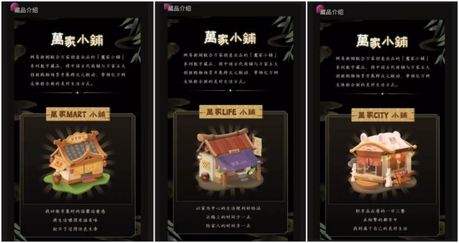 最火爆出圈的「萬家小鋪」NFT當屬萬家系列了。比如這個消費者所熟知的萬家MART,大家都可在這里找回逛集市時的溫馨治愈感;而萬家LiFE則是以家為中心的生活便利補給站,讓大家可以在路上的時間少一點,陪家人的時間多一點;萬家CiTY是輕享高品質(zhì)的一日三餐,在紛繁的都市中,找到屬于自己的美好生活。