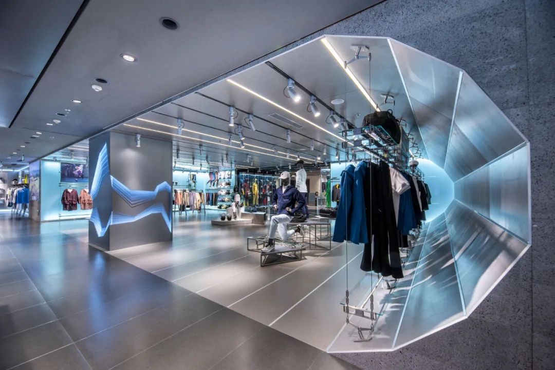 區(qū)別于北京三里屯,中信泰富DKL的一層主入口處,全新打造的科技雪山裝置櫥窗,以雪山和雪道斜坡為靈感,以數(shù)字化設(shè)計(jì)語(yǔ)言講述著迪桑特“一切始于滑雪“的故事;如冰雪般通透的藍(lán)白發(fā)光背景墻貫穿全店,二層女子運(yùn)動(dòng)專區(qū)則以滑雪時(shí)在雪道上留下的蜿蜒雪痕為設(shè)計(jì)靈感,將雪痕線條元素與女性柔美的曲線相結(jié)合;而標(biāo)志性D空間的靈感來(lái)源于迪桑特在追求滑雪極致速度上所經(jīng)常使用的風(fēng)洞實(shí)驗(yàn)室,“D”形縱向延伸通道,鏈接品牌歷史和未來(lái)。