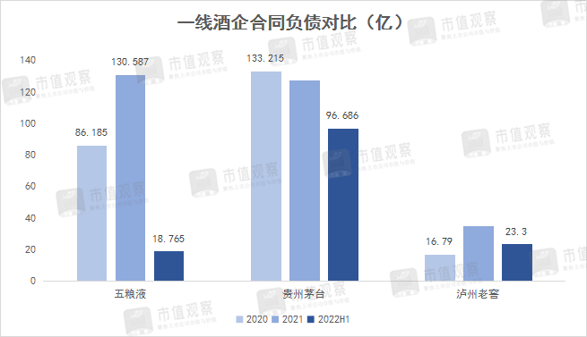 同時,在另一項酒企經(jīng)營核心指標(biāo)“合同負(fù)債”上,五糧液同樣降幅驚人。合同負(fù)債是經(jīng)銷商交給廠商的預(yù)存貨款,數(shù)額的多寡,能夠大體推測酒企的受歡迎程度以及未來業(yè)績。今年上半年,五糧液合同負(fù)債為18.76億,跌幅超過70%。而貴州茅臺同比增長4.6%達到96.69億;瀘州老窖23.3億,同比增長達65.48%。其他二線酒企如汾酒和洋河的合同負(fù)債也都是處于增長狀態(tài)。