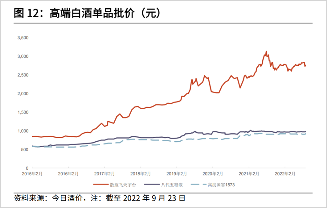 需要注意的是,五糧液不斷走低的增速還是建立在2021年底的一輪提價潮之上。五糧液將出廠價由889元提升至969元,終端零售價由1399元提升至1499元,全面對標(biāo)飛天茅臺。