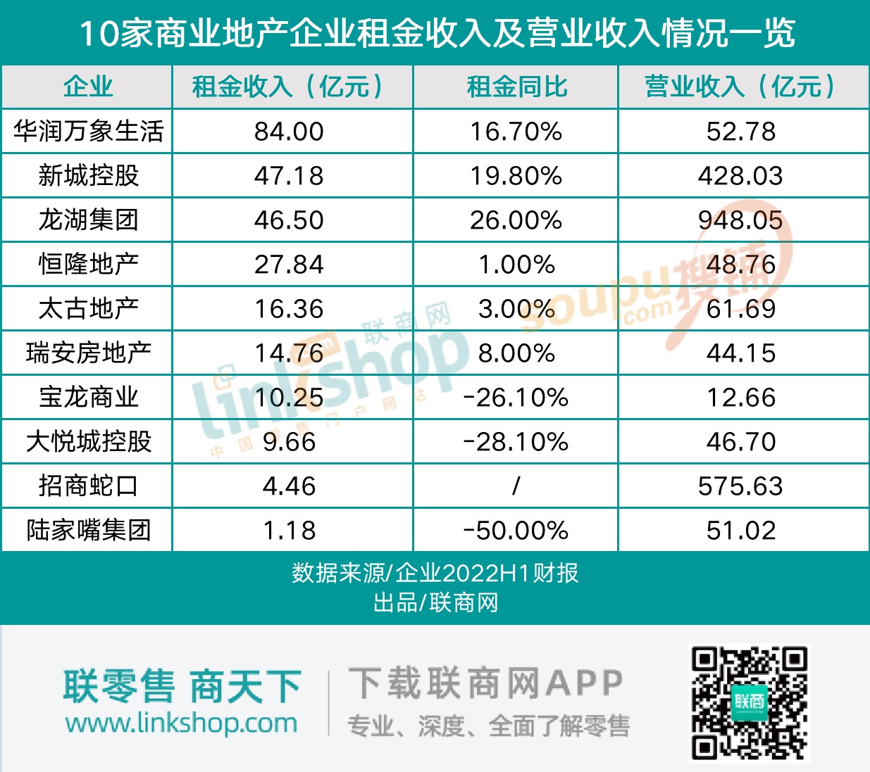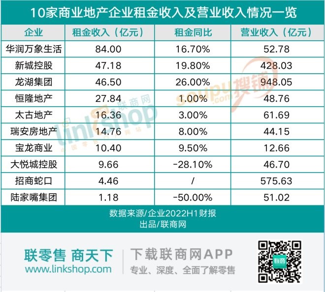 10家重點商業(yè)地產(chǎn)企業(yè)2022年上半年租金收入情況