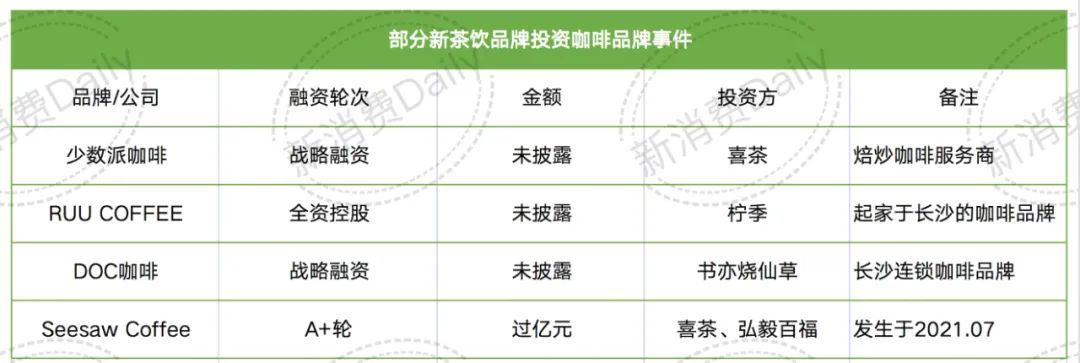 新消費(fèi)Daily也曾在《Manner入股「阿嬤手作」,“咖啡奶茶”殊途同歸?》一文中指出,近兩年,包括喜茶、奈雪的茶、蜜雪冰城、CoCo等在內(nèi)的,早已通過推出全新品牌或投資入股的方式,入局咖啡賽道。
