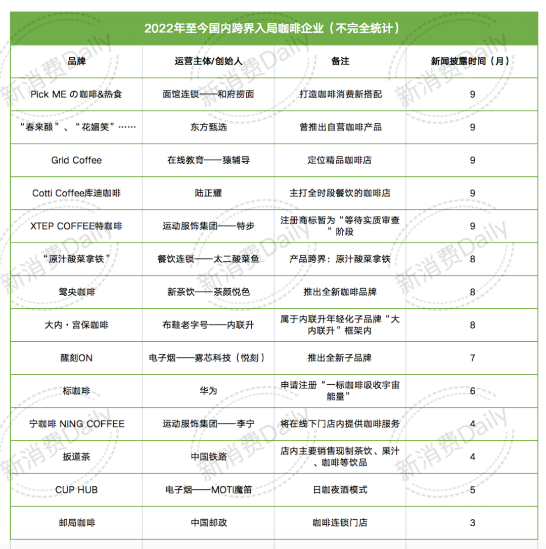 據(jù)新消費(fèi)Daily不完全統(tǒng)計(jì),自2022年開年至今,已經(jīng)有14個(gè)國(guó)內(nèi)企業(yè),以不同形式跨界走進(jìn)咖啡賽道。