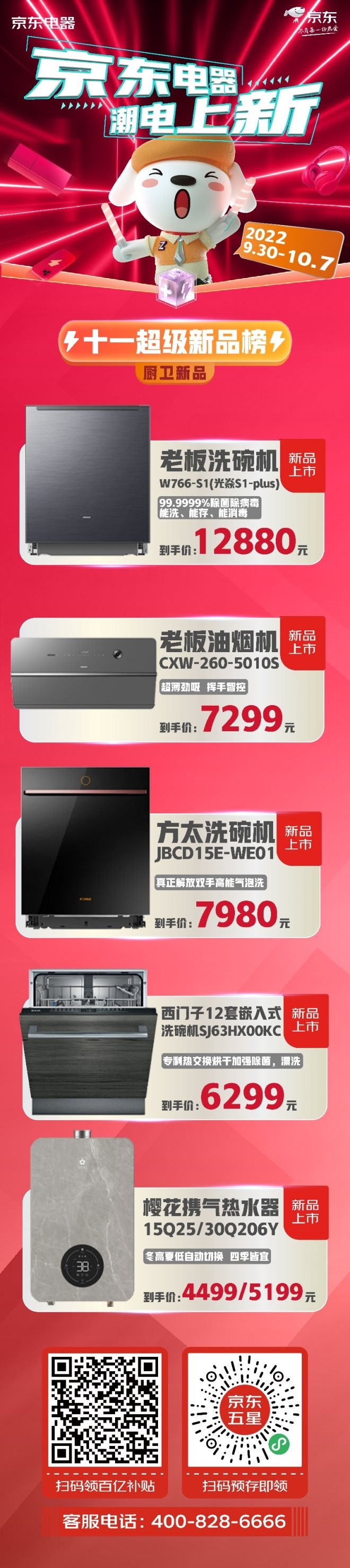 “十一”黃金周大促今天正式迎來高潮期,在秋裝和新婚新居需求的釋放下,廚衛(wèi)家電市場迎來“黃金周”。主打家務(wù)自由的洗碗機和健康生活的凈水器繼續(xù)引領(lǐng)廚衛(wèi)增長。油灶方面,集成灶和智能操控機型增長迅猛。京東五星電器在國慶大促期間聯(lián)合西門子、方太、老板、美的、卡薩帝、華帝等品牌推出系列主打健康、抗菌、智能升級的廚衛(wèi)新品。