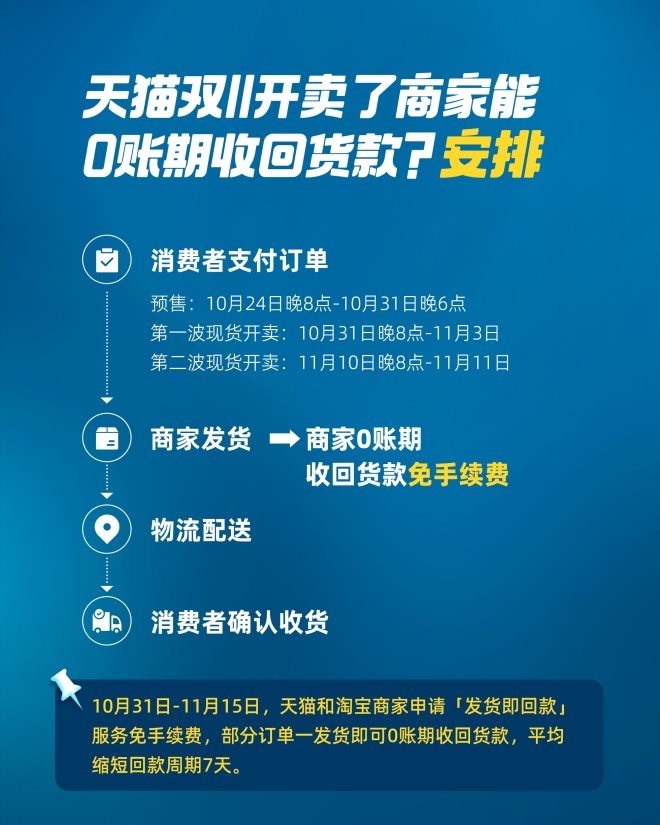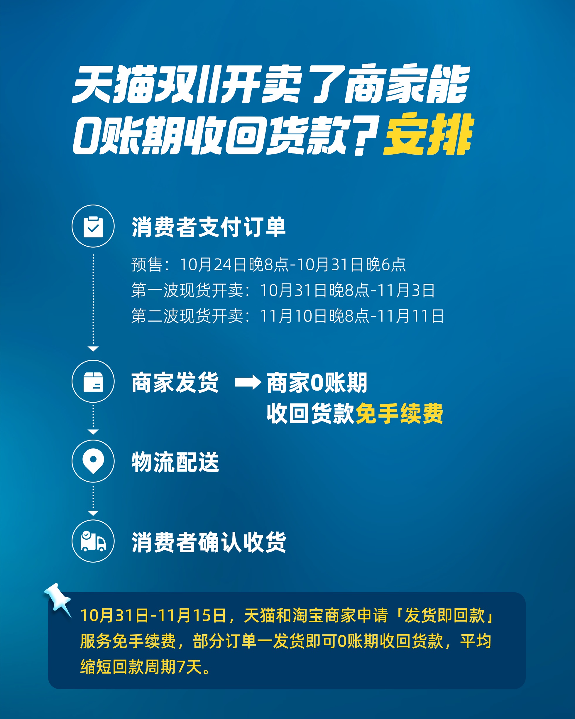 在雙11開(kāi)賣(mài)期:10月31日-11月15日期間,天貓和淘寶商家申請(qǐng)「發(fā)貨即回款」服務(wù)免手續(xù)費(fèi),部分訂單一發(fā)貨即可0賬期收回貨款。