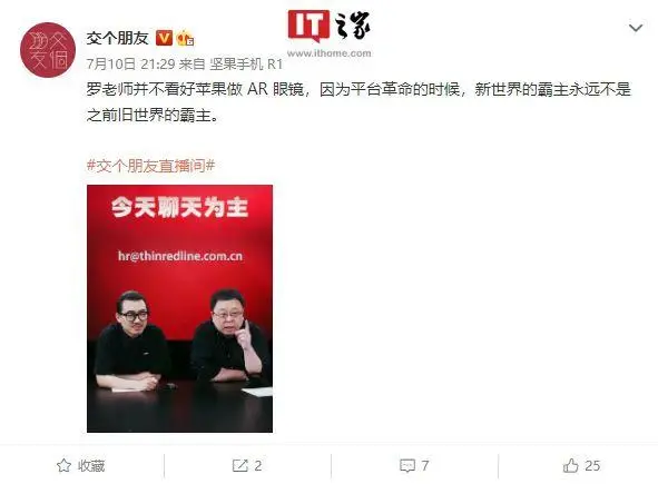 目前舉全力進(jìn)軍AR設(shè)備的只有蘋果,但羅永浩并不認(rèn)為蘋果可以成為新時(shí)代霸主,因?yàn)椋?/p>