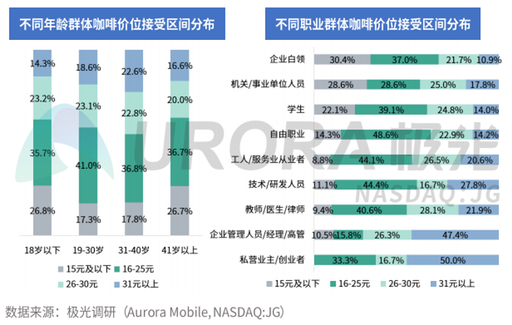 在產(chǎn)品價(jià)格上,瑞幸繼續(xù)延續(xù)平價(jià)策略,用性價(jià)比撬開人群。數(shù)據(jù)顯示,全年齡群體所能接受的咖啡價(jià)格在16-25元的咖啡價(jià)格,顯然星巴克不在這個(gè)區(qū)間,而瑞幸在。