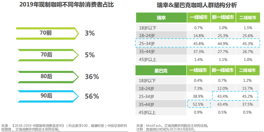 據(jù)艾瑞咨詢的數(shù)據(jù),2019年現(xiàn)磨咖啡消費(fèi)占比中,90后占56%。而在一線城市中,瑞幸的主要用戶年齡為25-34歲,占比45.8%;星巴克的主要用戶年齡為35-44歲占比52.5%。