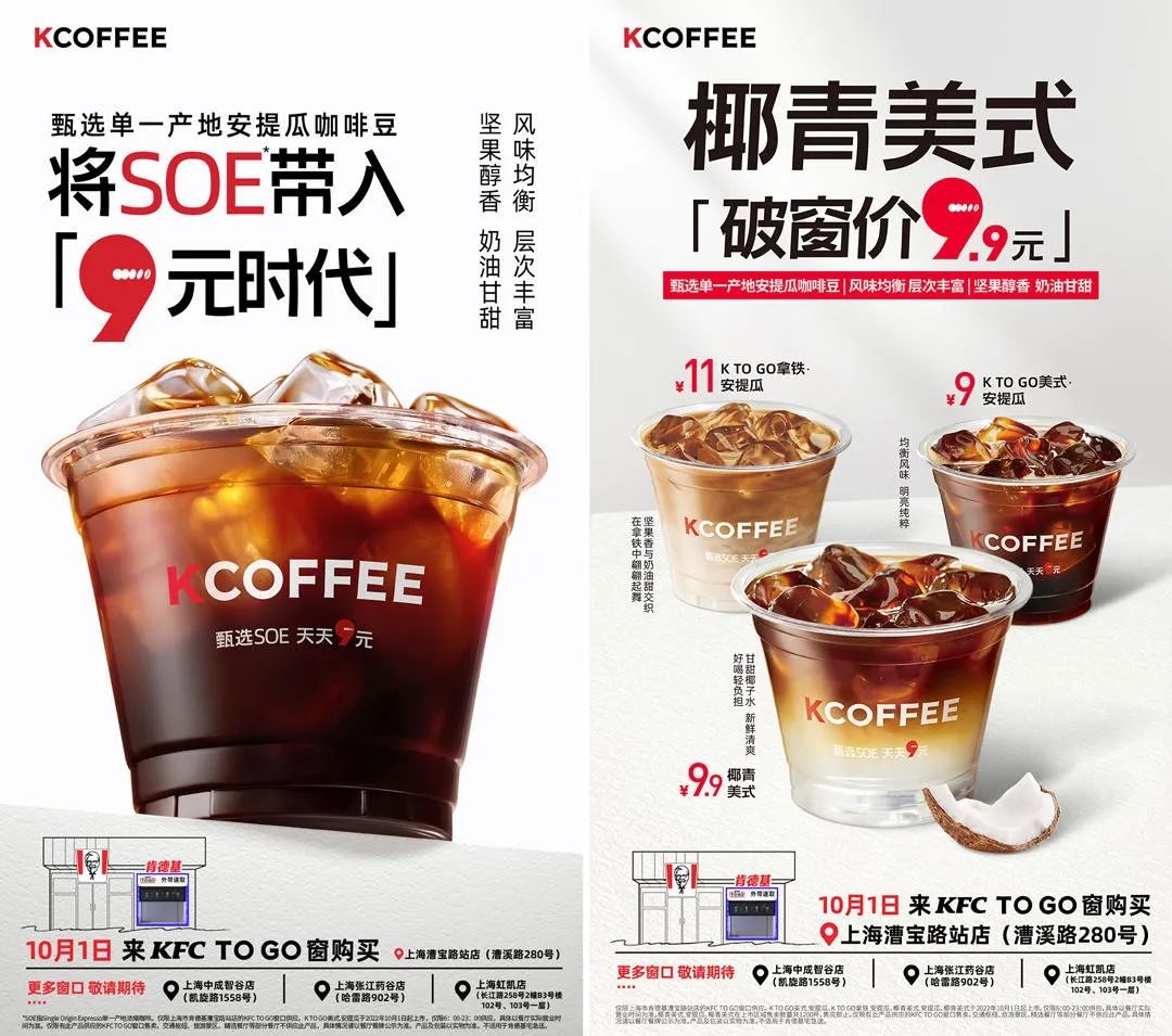 值得關(guān)注的是,在“破窗”后,KCOFFEE依托KFC TO GO快取窗在提供便利取餐外,還將提供差異化單品——擁有顛覆性價格的SOE咖啡。