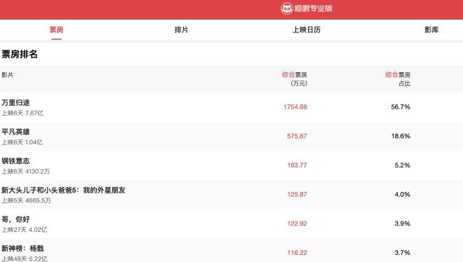 另據(jù)貓眼專業(yè)版顯示,截至10月5日08時30分,《萬里歸途》票房最高,上演6天已至7.67億元;《平凡英雄》上映6天票房至1.04億元。