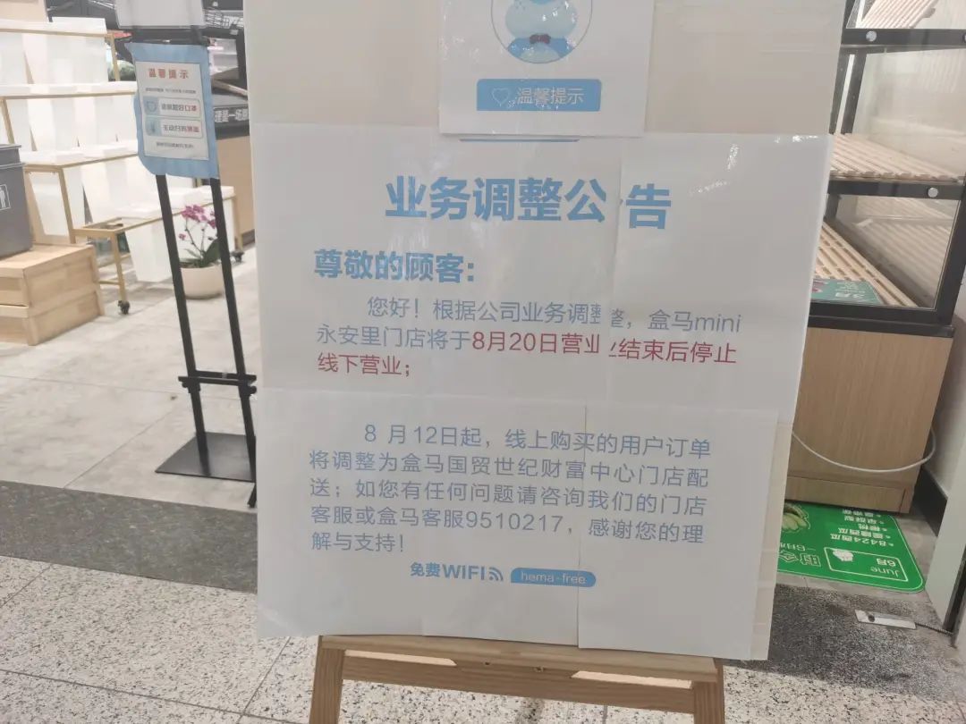 根據(jù)洋洋提供的圖片,該門店撤店公告顯示“根據(jù)公司業(yè)務(wù)調(diào)整,盒馬mini永安里門店將于8月20日營業(yè)結(jié)束后停止線下營業(yè)”。
