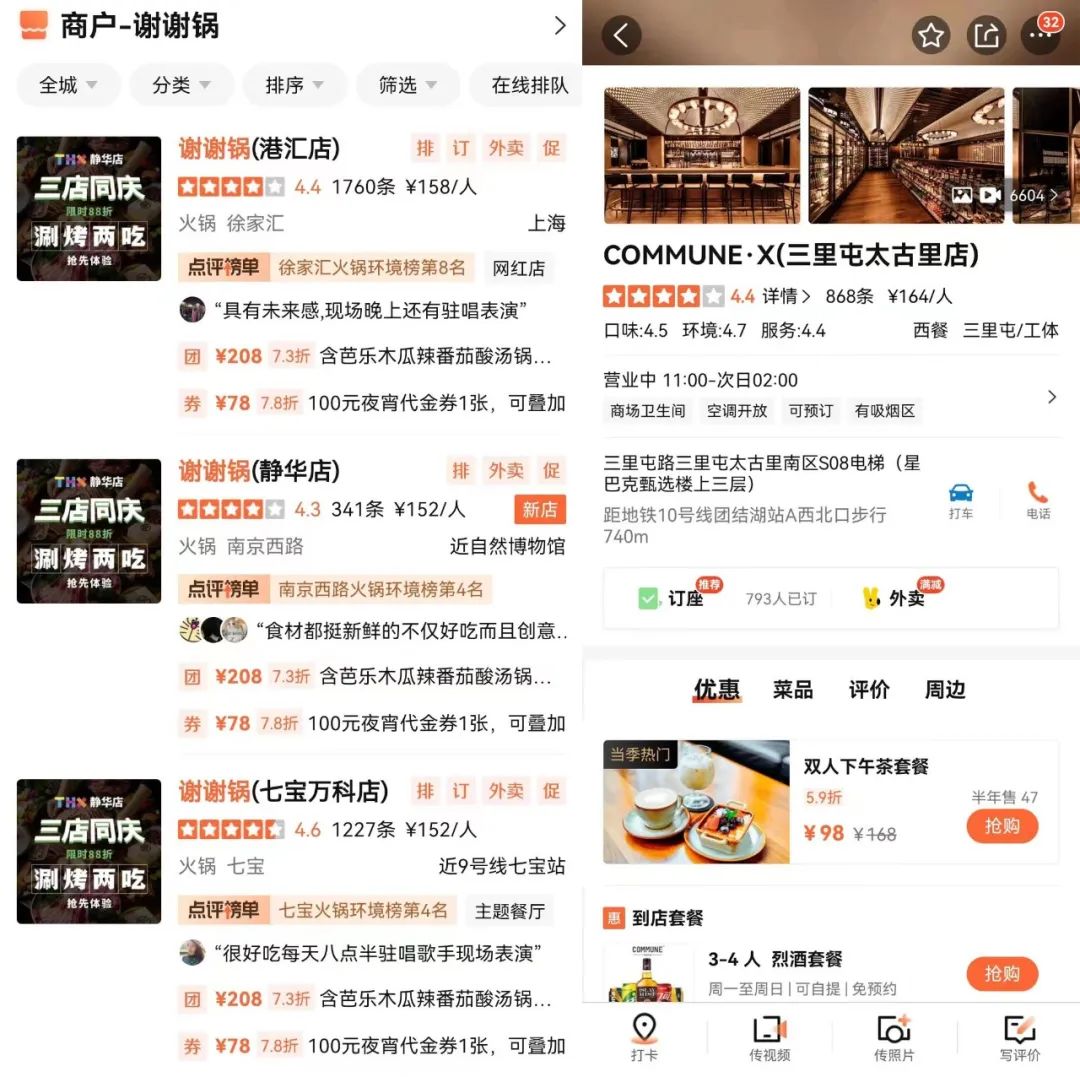 3、融合業(yè)態(tài)的“馬太效應(yīng)”逐步加劇。謝謝鍋創(chuàng)立不到1周年,上海已經(jīng)“三店同慶”,內(nèi)參君發(fā)現(xiàn),各家門(mén)店均上榜該區(qū)域的點(diǎn)評(píng)榜單;COMMUNE在全國(guó)大舉開(kāi)店后,又在網(wǎng)紅地標(biāo)太古里,開(kāi)出“COMMUNE·X”新品牌,打造“甄選”店型。