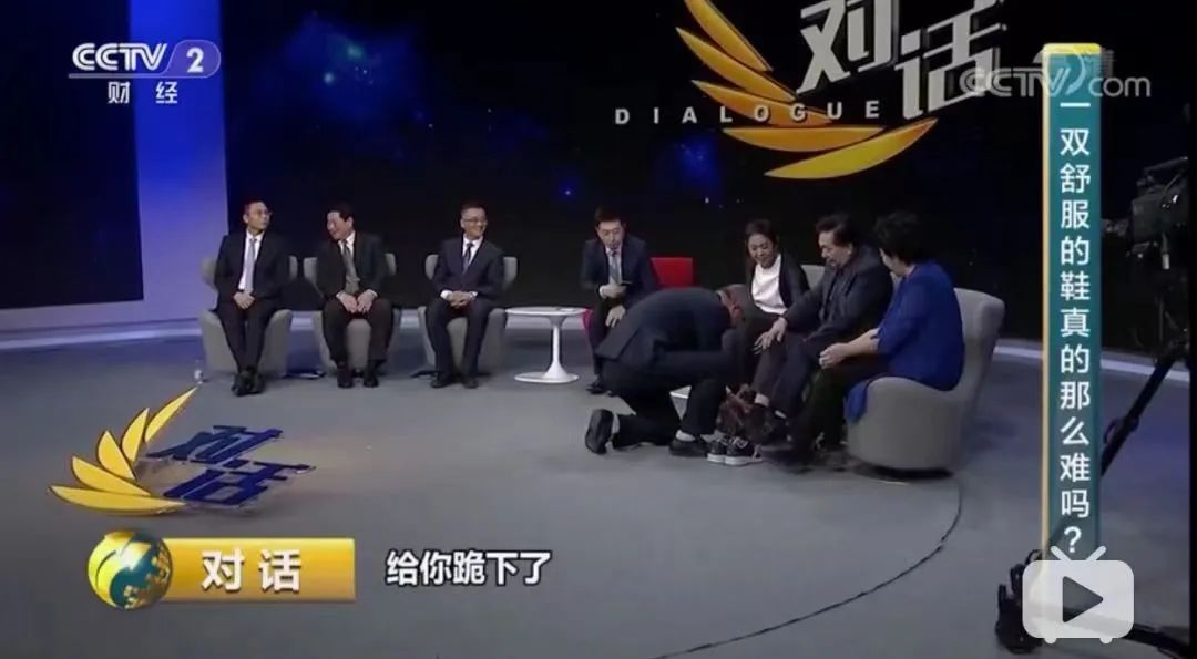 2019年,在央視《對話》節(jié)目上,當著全國觀眾的面,足力健創(chuàng)始人張京康拎著鞋走上臺,咔嚓一聲就跪下了,邊給嘉賓換鞋,邊用手摸著其足弓。